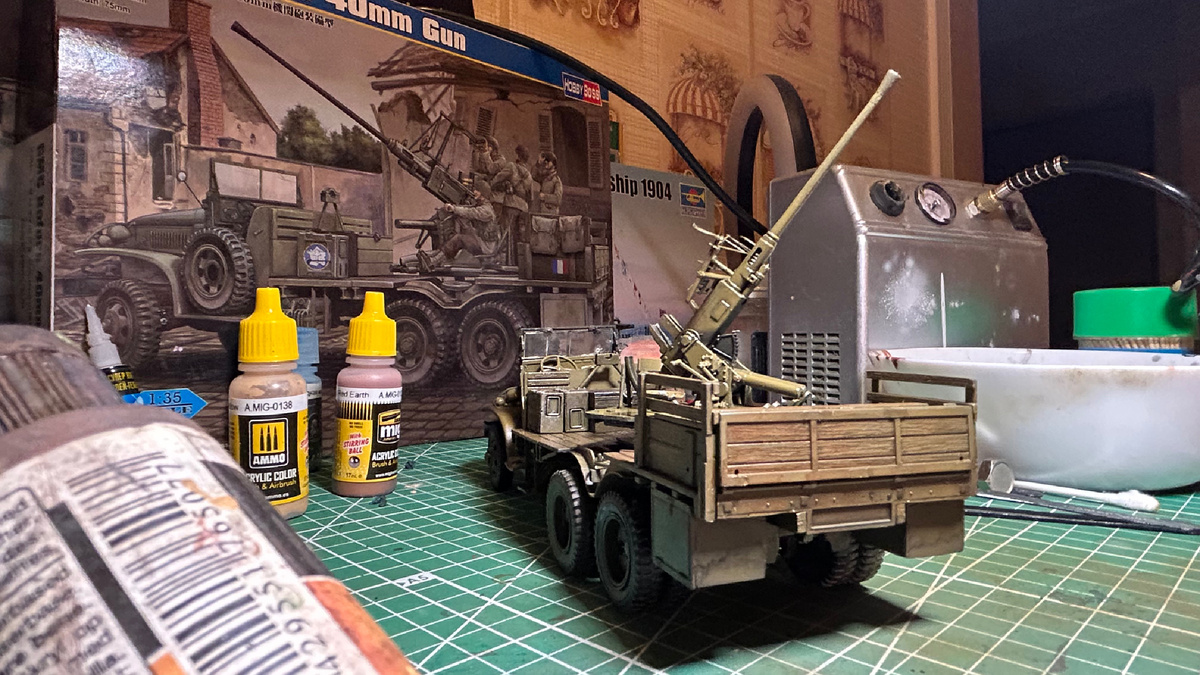 Здравствуйте, мои дорогие любители волшебного пластика. Финал с зениточкой не за горами. Как-то я очень бодро под завязку лета взялся за этот проект, так что счёт идет на дни. Не планировал честно говоря делать сегодня репортаж, но уж больно казисто получилась платформа, что я не смог отказать себе в возможности похвастаться. Вооот…. Смотрииите!!! И вооот еще. Мне кажется, что шалость удалась и кузов получился таким каким я его и хотел увидеть. Мне как-то попеняли, что модельный блоггер должен быть полезным, поэтому что бы мой репортаж выглядел не просто хвастовством, я расскажу как добился этого результата. Все что надо, это всего лишь три краски… И две проливки… Перво наперво задуваем в базовый цвет. В моем случае это olive drab. Классический цвет американского камуфляжа. Это как 4БО, только по американски. Дальше я начинаю кисточкой проливать текстуры. Там где металл, напрашивается черная проливка. Там где текстура дерева, более теплая, коричневая. Местами, можно поиграться ч