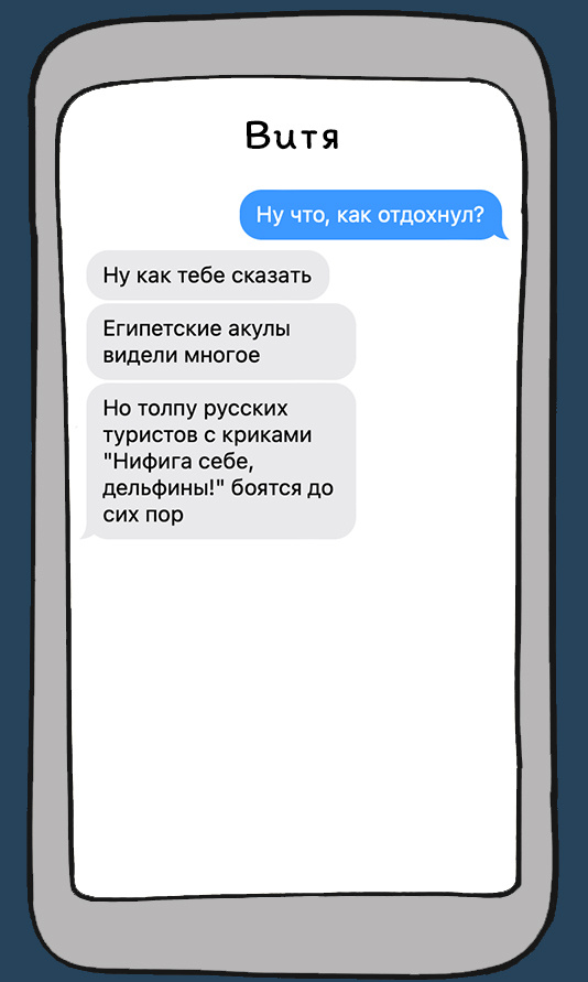 Здравствуйте, дорогие читатели! Мы тут задумались: а вы считаете, сколько раз в день вы улыбаетесь? 100, 10, а может быть ни одного? Я максимально надеюсь, что последний совсем грустный вариант не про вас! А если всё же про вас, то эта публикация точно вас развеселит! Ведь сегодня мы приготовили для вас смешные переписки об отдыхе, особенностях организма, вредных привычках и многом другом. Читайте, смейтесь и заряжайтесь юмором! PS: и на канал не забывайте подписываться! Слышали эти истории о русских отдыхающих? Только наши туристы могут создать российское посольство в любом городе мира. Причём посольство стихийное и невероятно весёлое! Народная медицина иногда помогает. Конечно, мы рекомендуем вам доверять только профессиональным медикам и следовать их рекомендациям. Но часто советы друзей, как избавиться от того или иного недуга могут быть смешными. А их последствия непредсказуемыми. А какие зависимости есть у вас? Среди них имеется такая, когда ты просто включаешь компьютер и и на п
