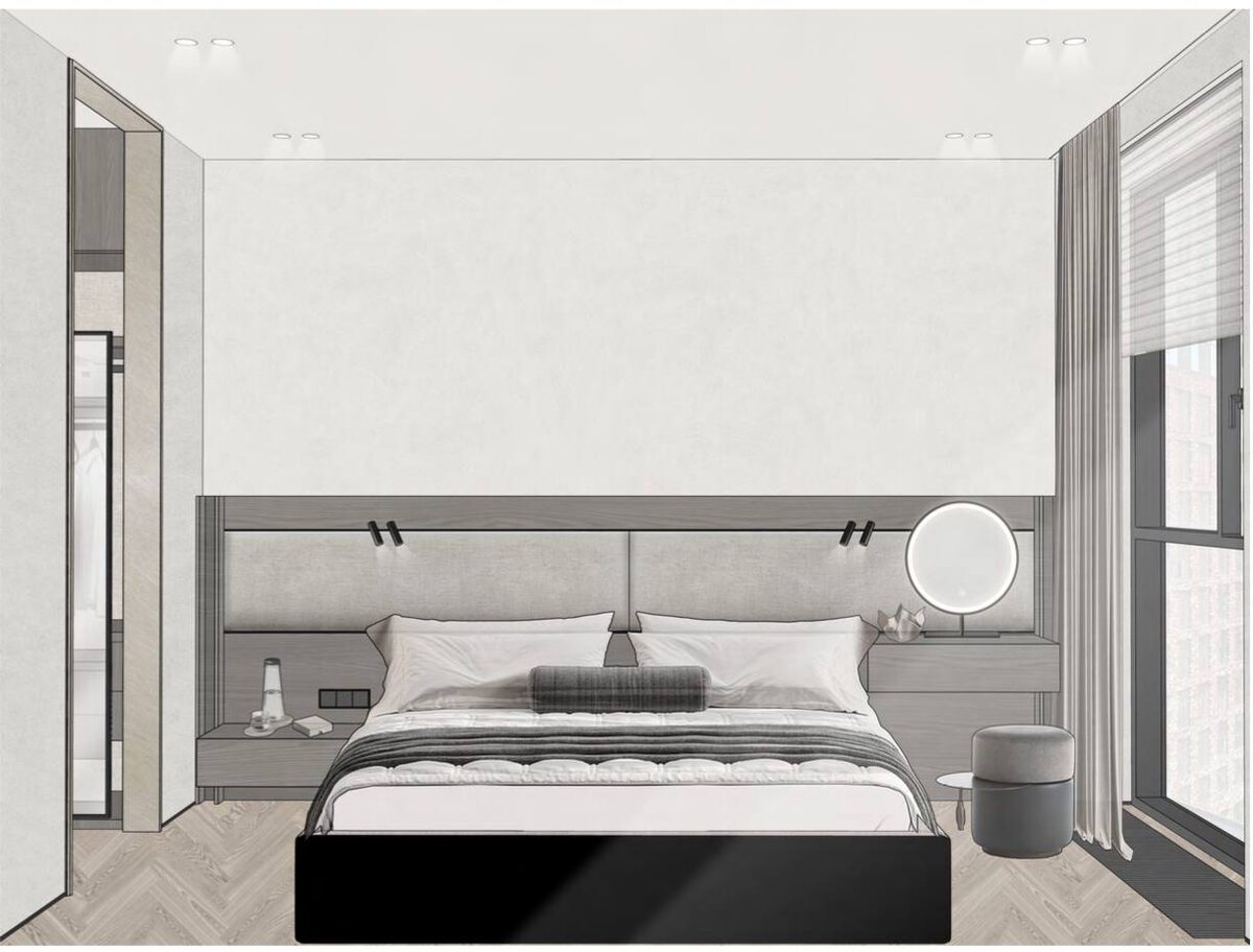 Площадь всей квартиры всего 35 м2. Необходимо было: сделать планировку с отдельной спальней, но при этом кухню-гостиную нужно было оставить максимально "просторной" В итоге большая часть площади отведена на кухню-гостиную и всего 8 м2 на спальню. Если обратите внимание и вверх и низ кровати упираются в стены. Широкими остались только проходы по 900 мм. Мы сделали две сдвижные двери со стороны гостиной и сместили стену вплотную к кровати, тем самым проход спальни отдали на более "просторную" гостиную. — Делитесь своим мнением в комментариях, как вам такое решение?