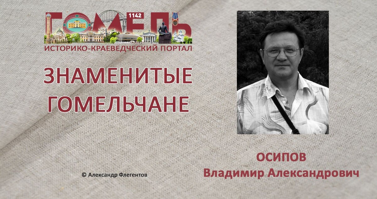 Владимир Александрович Осипов (22.04.1956, пос. Палех Ивановской обл.) — белорусский художник. Член Белорусского союза художников (1995). В 1960 году семья переехала в Гомель. В 1975 году окончил Минское художественное училище, отделение «скульптура». В 1982 году — окончил Белорусский государственный театрально-художественный институт (ныне Белорусская государственная академия искусств), отделение ДПИ. Работал на головном предприятии «Белхудожкерамика» (городской поселок Радошковичи, Минская область) художником декоративно-прикладного искусства (1982-1985 ); в художественно-производственных мастерских г. Гомеля, комбинате «Мастацтва», СШ №58. С 2014 года директор ГУО «Детская художественная школа искусств г. Гомеля». Был одним из организаторов участка керамики, выпускавшего напольные вазы, кашпо и другие изделия на Гомельском заводе пусковых двигателей (1993). Работает в монументально-декоративном искусстве. Основные произведения: витражи «Родина» (1988), «История архитектуры