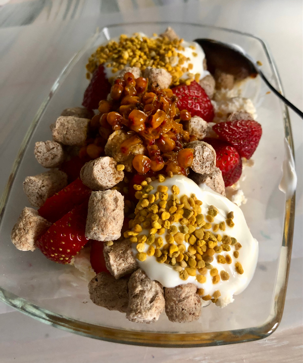 Так как мой канал - это личный дневник, то оставлю здесь напоминалку о моих завтраках летом этого года. Возможно, в скором времени мои завтраки претерпят кардинальные изменения, но пока так. Почему-то этим летом я люблю завтракать творогом с различными добавками. Пробовала на завтрак бутерброды, яйца, каши - не зашло. Творог - норм. Вот пример моего обычного завтрака: творог 2%, белый йогурт 3,5%, свежие ягоды, ложечка меда с пергой и ложка цветочной пыльцы (если есть), ложка облепихового сиропа с ягодами (самодельного) и непременно - отруби. Отруби я люблю только такие - я их называю "козьи какашки". Кажется, что порция для завтрака слишком большая. Но это не так. Моя стеклянная прямоугольная тарелочка длиной 15 см и шириной 9 см. Маленькая. Еще один завтрак, точно такой же, но без облепихи. Зато с абрикосовым джемом без сахара. Сверху-ложка меда с пергой. Обычно я покупаю творог 2% жирности. Но у нас за городом много соблазнов - можно покупать натуральные продукты. Натуральный дома