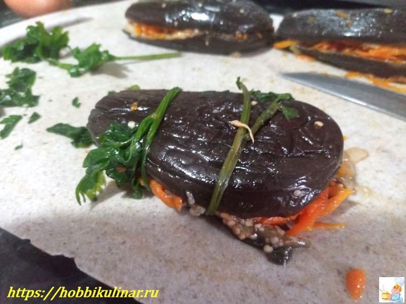 Шаг 19. Если баклажан разделился на две части, на одну половинку положите начинку, второй закройте.