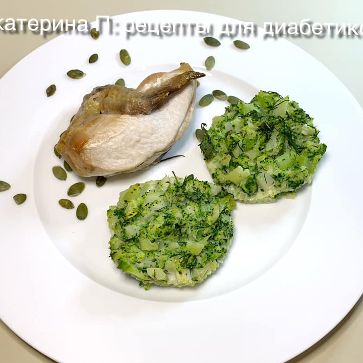 ✔Брокколи – ~500 г; ✔ Яйца – 3 шт.; ✔ Молоко или сливки – 100 мл; ✔ Зелень (укроп, петрушка, зелёный лук) – 25 г; ✔ Соль - по вкусу. Брокколи разделить на соцветия, промыть, опустить в кипящую воду минуты на 3. Вынуть брокколи, обдать холодной водой. Дать немного остыть. Мелко нарезать. Зелень измельчить. Смешать с брокколи. Яйца взбить с молоком или нежирными сливками. Если есть непереносимость лактозы, можно использовать соевое молоко. Добавить яично-молочную смесь к брокколи с зеленью, посолить, перемешать. Разложить по формочкам для запекания (у меня – силиконовые). Отправить в духовку запекаться на 10-15 минут при 180 градусах. Готовые котлетки можно подать на гарнир. Примерное КБЖУ на 100 г - 64/5,0/3,2/4,9. + 8 фото Рецепт на странице Автор рецепта – Екатерина П. © Почтенный возраст Online и Рецепты для диабетиков