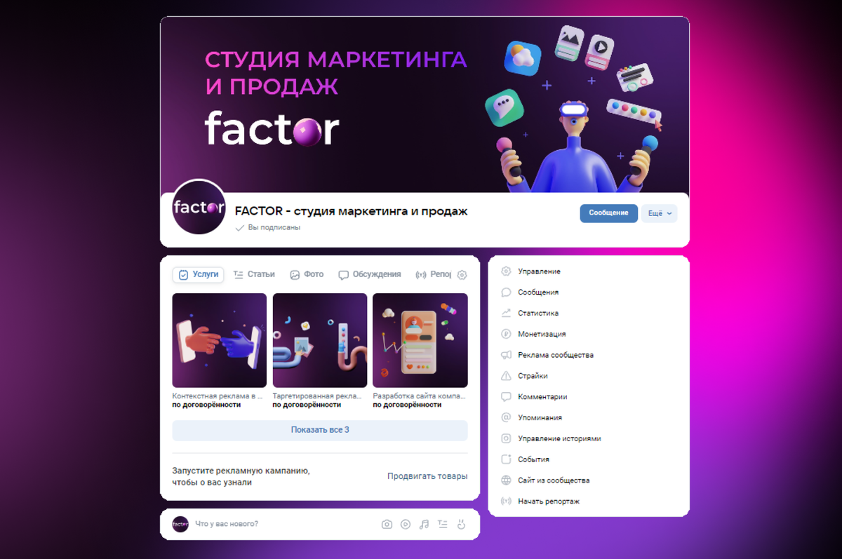 - Информативность. Возможности оформления страницы во ВКонтакте обширны — при грамотном подходе здесь можно продемонстрировать продукцию, создать удобную навигацию по группе, анонсировать предстоящие мероприятия и разместить ссылки на важные ресурсы на видном месте. Таким образом, оформление группы может нести значимую информационную нагрузку — даже если пользователь ещё не дошёл до основной новостной ленты.