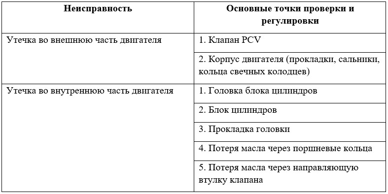Классификация расхода масла по основным неисправностям: Масло, смазывающее стенки цилиндра не удаляется поршневыми кольцами, а попадает в камеру сгорания. Если дать двигателю полные обороты после прогрева, работы на холостых оборотах или частоте вращения около 1000 об/мин в течение 4 - 5 минут, в первые 30 - 60 секунд образуется большое количество выхлопных газов бело-фиолетового цвета, после чего их количество снижается. В этом случае, если дать двигателю полные обороты после работы на холостых оборотах или частоте вращения около 1000 об/мин еще в течение 4 - 5 минут, то опять выделяется большое количество выхлопных газов бело-фиолетового цвета, как и ранее. Лечение – замена поршневых колец. Подтверждение при снятии головки блока. Вокруг верхней части поршня видно значительное отложение нагара. Масло попадает в камеру сгорания через зазор между штоком и направляющей втулкой клапана. После прогрева двигателя повысьте его обороты до 2000 об/мин и проверьте выхлопные газы. При этом выдел