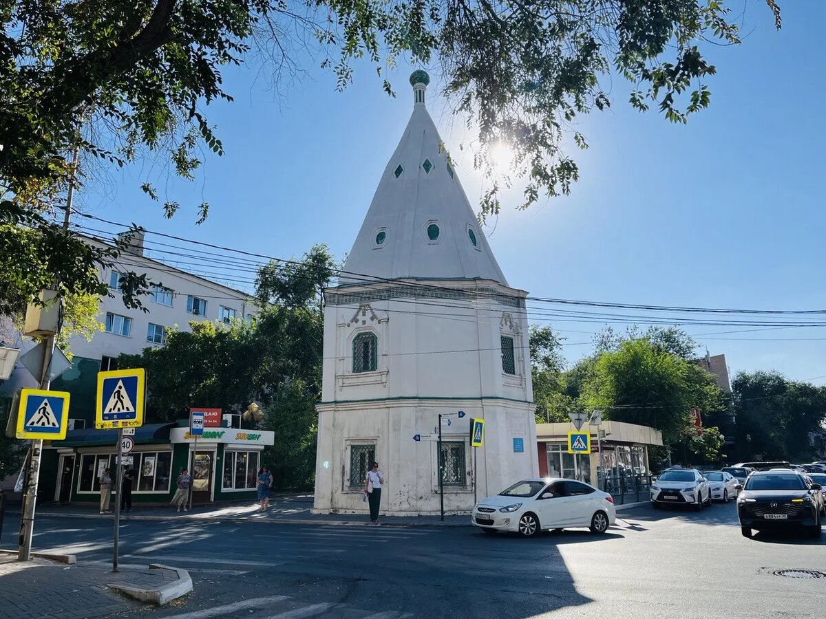 Небольшое, но очень приметное белое здание на Коммунистической с флюгером в виде льва и винтовой лестницей внутри – одно из самых узнаваемых в Астрахани. С незапамятных времен там находилась иконная лавка. Но сейчас лавка переехала по соседству, а в самой Башне идут какие-то работы.