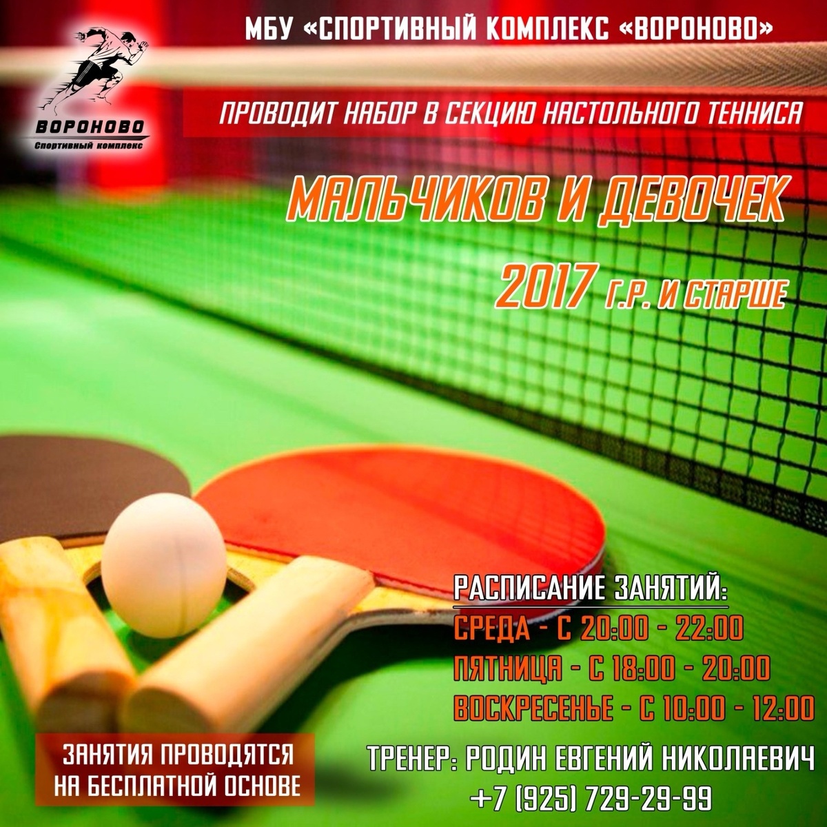 МБУ "Спортивный комплекс "Вороново" проводит набор мальчиков и девочек 2017 г.р., и старше в секцию "Настольного тенниса".