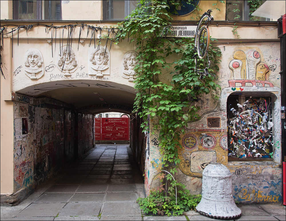 Мы оказались на улице Джона Леннона! Собственно, улицей это можно назвать весьма условно. На самом деле это — один из внутренних двориков арт-центра «Пушкинская,10». Но название «улица Леннона» за ним закрепилось уже давно. И в советские времена были попытки официально закрепить это название. Окончились они, разумеется, неудачей. Теперь, однако, улица Джона Леннона уже значится на картах…
