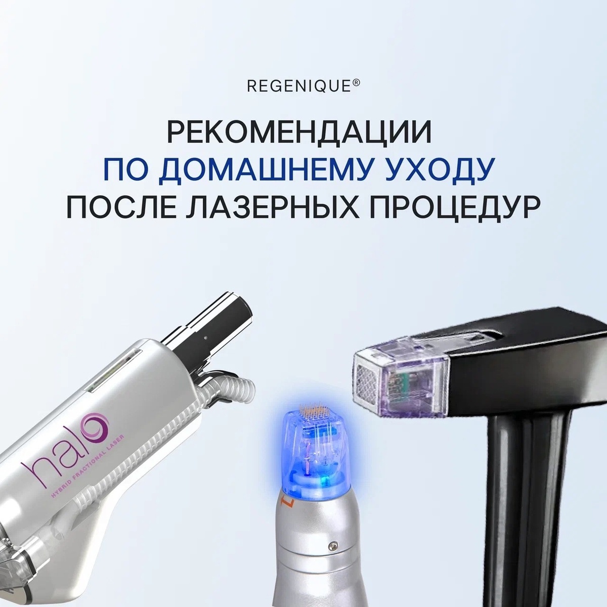 1. Использование регенерирующего геля REGENIQUE®: рекомендуется применять регенерирующий гель в течение 2-4 дней после процедур, нанося его 2-3 раза в сутки. Этот гель способствует быстрому восстановлению кожи, благодаря своим увлажняющим и успокаивающим свойствам. Он помогает снять покраснение, уменьшить отёк и ускорить процесс регенерации кожи.