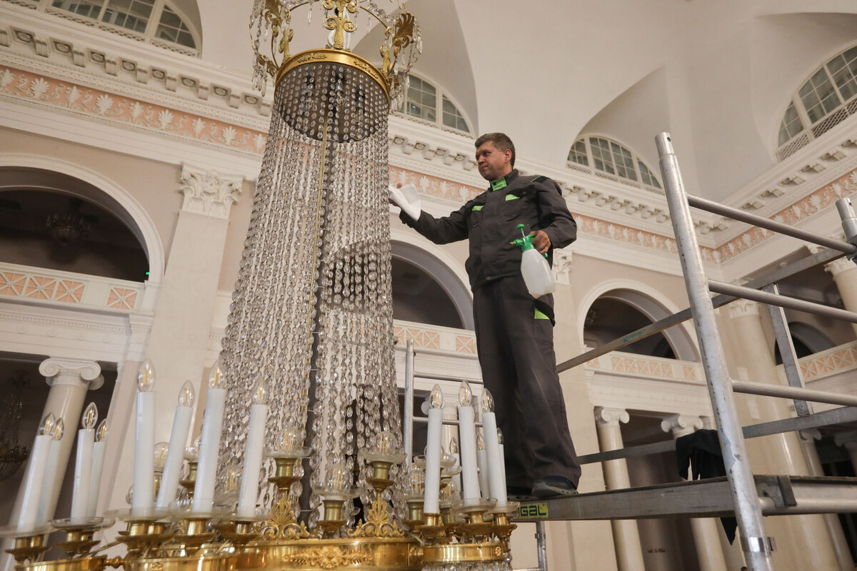 Вчера в Большом зале Филармонии имени Шостаковича прошло грандиозное событие, которое случается только раз в год. Здесь помыли величественные хрустальные люстры.