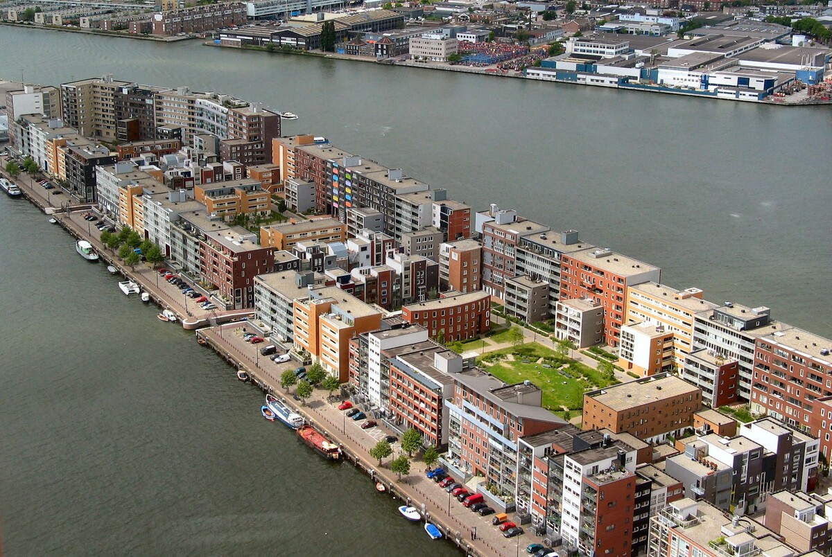 В нынешнем центре Амстердама существует район, который называется Борнео-Споренбург или Восточные доки. С 1876 года здесь располагались портовые склады (Амстердам - один из крупнейших портов в Европе). К 1960-м годам выяснилось, что порт, в этом месте, не в состоянии принимать длинномерные контейнеровозы и доки пришли в запустение. Голландцы долго ломали голову, что теперь делать со 140 Га земли и 160 Га водной поверхности в промышленной зоне. Там построено более 8 тысяч жилых зданий. Места стали модными, за жильем потянулись рестораны, клубы, бутики, галереи и прочая культурная жизнь. Первоначальной идеей было застроить многоэтажным, по меркам голландцев, жильем в 10-14 этажей. Но голландцы, несмотря на недостаток земли и большую плотность населения, не очень любят многоэтажки. И вот после долгих проработок архитектурному бюро West 8 удалось найти остроумное и элегантное решение задачи. Они придумали, как при трехэтажной плотной застройке получить количество квартир бо