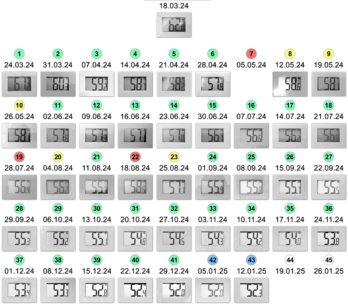 Сила Ярославны. Итак, товарищи все (может, я одна) этого ждали. И этот миг пришёл. В силу входит Гриша. Ага, а вы думали всё это ради меня? Да нет, конечно (великий русский язык))) Силе уже больше года. И я всё мечтала, что и Гриша сюда заглянет... как-нибудь, когда-нибудь, может быть. И вот... кто ждёт, тот дождётся. Гриша входит в силу (прям метафора). С 5 января у него своя табличка, свои шаги и силовые он делает со мной (один раз сделали, но всё же). Табличку его я пока публиковать не буду. Но шаги и силовые - да. Ура. --- Моя сила. 1. Табличка с весом. Цель: публиковать табличку и сохранение коридора веса в 51-53 кг до 18 марта 2025 года. Скажу сразу, мне сложно психологически видеть прибавку. И да, я читала об этом (о том, как люди сходят с ума по этому поводу), поэтому я считаю, что очень важно выстроить ровное отношение к коридору веса. Что и делаю. Выстраиваю. 2. Шаги. Гришины. 3. Силовые. Они у нас общие. И будут просто на календарике. Я - жёлтая. Он - зелёный. Вмес