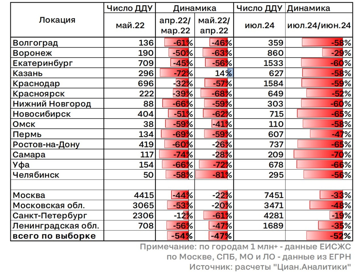 Так, в мае 2022 года в Волгограде было зарегистрировано 136 тысяч договоров долевого участия (договор между покупателем и застройщиком о покупке жилья в строящемся доме). Специалисты в сфере недвижимости замечали резкое снижение спроса уже тогда, сравнивая продажи в апреле и марте 2022. Динамика была со знаком «минус» 61%. Сравнивали данные и за май-апрель 2022. Темпы продаж чуть подросли, но незначительно, динамика фиксировалась со знакомы «минус» 46%. В июле 2024 число заключенных договоров долевого участия в Волгограде на покупку жилья в новостройках составило 359 тысяч. По сравнению с июнем, это был последний месяц с действующей льготной ипотекой, динамика продаж квартир в волгоградских новостройках рухнула сразу на −58%. Подобное можно было наблюдать только в 2022 году, продажи в июле оказались в два раза хуже июньских. Специалисты в сфере недвижимости говорят, что это даже трудно назвать «резким снижением», «обвалом», «сокращением вдвое». Волгоград оказался в четверке городов, гд