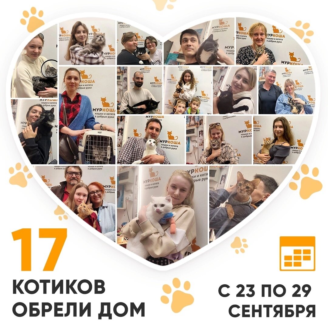 Друзья! Сегодня среда, и мы, как обычно, подводим итоги работы «Муркоши» за прошедшую неделю. Кто же стал счастливым выпускником Центра помощи кошкам «Муркоша» с 23 по 29 сентября 2024 года? 😺 🥳 Итак, за прошедшую неделю домашними и любимыми стали 17 котиков! У чёрно-белой Лайбы умерла любимая хозяйка. Но кошечку не оставили в беде, а привезли к нам. Лайба снова стала радоваться жизни и нашла себе новую семью! Кошечка приехала к нам с передержки вместе с братом Гарвеем и сестрой Ферги, которые совсем скоро стали домашними. А вскоре удача улыбнулась и солнышку Иририки! Джинкси жила у подъезда на улице. Неравнодушные люди привезли кису в наш приют. Милая девочка адаптировалась и понравилась прекрасной девушке. И уже уезжает в свой дом! Феникс попал к нам из-за аллергии у бывших хозяев. Красивый вислоухий мальчик быстро обратил на себя внимание, и новая хозяйка забрала его в уютный дом! Милый котик Фейт раньше жил дома, но попал в наш приют. К счастью, Фейт уже нашёл себе нового хозяи