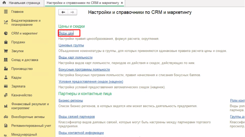 Чтобы включить контроль минимальных цен открываем справочник видов цен.