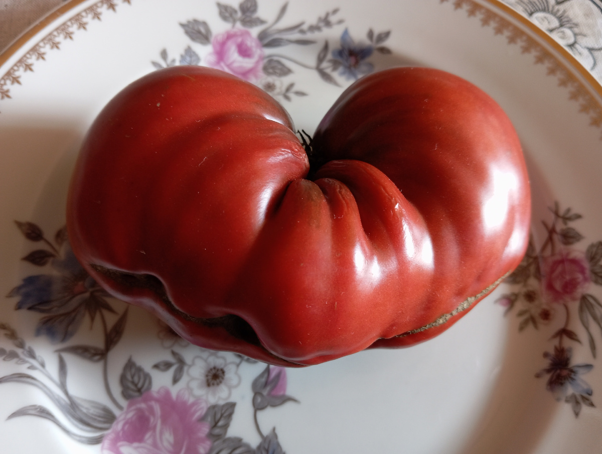 В этом году я сажала томаты-гномы в первый раз. Росли они у меня и в открытом грунте и в теплице. Сорта были разные, но один из них меня особенно порадовал. Необычная форма, размер плодов , особенный цвет и сладкий вкус - это все о томате-гноме "Пурпурное сердце". Вот такой больший плод вырос в открытом грунте и даже дозрел на кусту. И это в условиях севера Подмосковья. Крупноплодность гнома удивительным образом сочетается с его низкорослостью. У меня высота кустов была около полуметра, а вес отдельных плодов превышал 200 грамм. Когда все кусты других сортов томатов уже стояли обожженные фитофторой, то эти малыши-крепыши продолжали зеленеть и цвести. Оригинальное название томата Dwarf Purple Heart. Сорт получен путем скрещивания двух сортов Гном Дикий Фред и Черное сердце Бреда. Плод мясистый, семян мало, вкус сладкий с приятной томатной кислинкой.