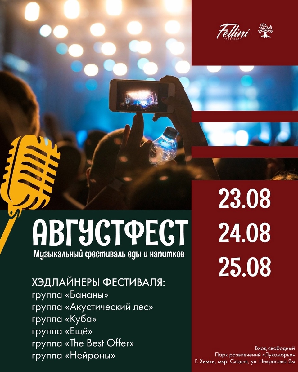 23, 24 и 25 августа в парке развлечений «Лукоморье» пройдёт яркий музыкальный фестиваль еды и напитков. Вас ждут: Хэдлайнеры фестиваля: Вход свободный, но нужно зарегистрироваться на сайте. Кстати, в качестве приятного бонуса за регистрацию вы получите промокод на скидку в точках «Fellini». Парк развлечений «Лукоморье»: г. Химки, мкр. Сходня, ул. Некрасова, 2 м. РЕКЛАМА ООО «СХОДНЯ-ИНЖИНИРИНГ» ИНН:5047039940 ERID:2VSB5YVSSBE