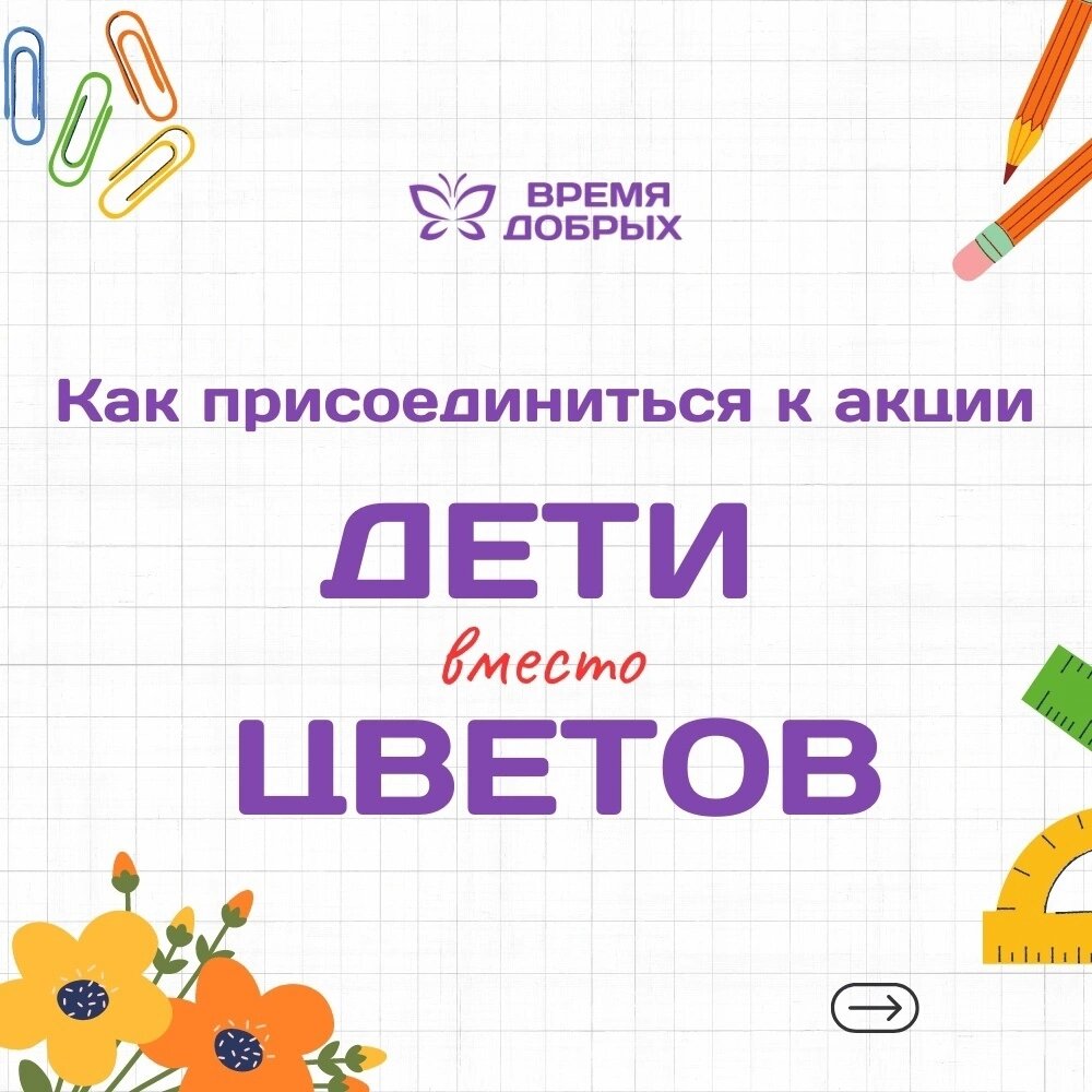 Фонд "Время Добрых" присоединяется к всероссийской благотворительной акции «Дети вместо цветов», приуроченной к 1 сентября. В рамках акции мы предлагаем школьникам вместо множества отдельных букетов подарить учителю один букет от класса, а сэкономленные средства направятся на помощь тяжелобольным детям ЛДНР. 🗓 Акция будет проходить с 1 августа по 15 сентября. ✅ Зарегистрироваться для участия в акции можно по форме: ➡ Подробнее о том, как принять участие в акции смотрите в карточках. Безопасность превыше всего: как участвовать в акции дистанционно и самостоятельно 🌟 С приближением 1 сентября мы все еще не уверены, смогут ли школы в ДНР начать учебный год в очном формате. Однако мы верим, что делать добро можно в любых условиях! В рамках нашей акции предусмотрены дистанционный и индивидуальный форматы участия. ✅ Дистанционное участие Вы можете сделать пожертвование из любой точки мира! Наша акция уже охватывает такие регионы, как ДНР, ЛНР, Тверская область и