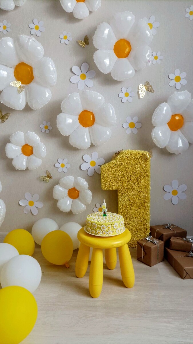 Добрый день, мои дорогие! Хочу поделиться идеей оформления фото зоны для девочки. Каждая мама с нетерпением ждёт первый день рождения своего малыша. Я не исключение, очень долго думала как украсить, какой стиль, какую тематику выбрать для украшения квартиры к этому важному событию. Начала подготовку за 3 месяца до праздника. Хорошо, что в декретном отпуске есть на это время. 🙂 Первое, что я сделала- это цифра 1. Изготовила её из картона. Использовала коробки от детской смеси. Склеила их между собой. Купила в гипермаркете "Европа" 3 упаковки жёлтых салфеток. Порезала их на ровные квадратики 3*3 см. С помощью техники торцевания обклеила цифру. Очень много времени потратила на это занятие. Цифра высокая 90 см. Квадратики салфеток клеила близко друг к другу, так мне показалось, что красивее. В итоге цифрой очень довольна, получилось красиво. Ещё для фото зоны нарисовала на картоне ромашки. Вырезала их и крепила к стене клеевыми точками. Вокруг этих бумажных цветов распо