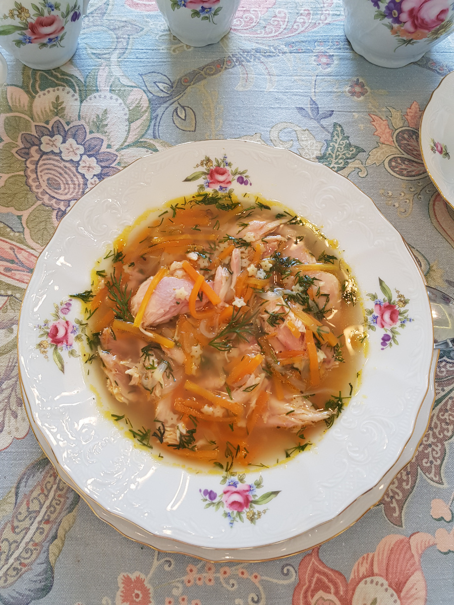 Добрый день, дорогие друзья! На улице становится прохладно, а куриный суп радует своим ароматом и теплом. Для приготовления нам понадобятся: куриные голени 2 кг, 1 большая морковка, 2 средние луковицы, 100 грамм макарон «Стеллине», пучок укропа, 1 столовая ложка соли, 1 столовая ложка приправы для курицы, 1 столовая ложка растительного масла. Приготовление: куриные голени сложить в кастрюлю и залить 3 литрами воды. Довести до кипения, посолить 1/2 столовой ложкой соли, снять образовавшуюся пену и варить на маленьком в течение 60 минут. Нарезать соломкой лук, морковь. Нагреть сковородку и слегка обжарить на растительном масле лук и морковь. Добавить пару ложек бульона, накрыть крышкой и потомить овощи на слабом огне в течение 7 минут. Выложить голени в тарелку, бульон процедить через марлю, сложенную в 2 слоя. Вымыть кастрюлю и собрать ложкой с поверхности бульона лишний жир, если не любите жирный суп. Готового бульона из 3 литров воды у меня получилось 2,7 л. Мясо очистить от шкурки,
