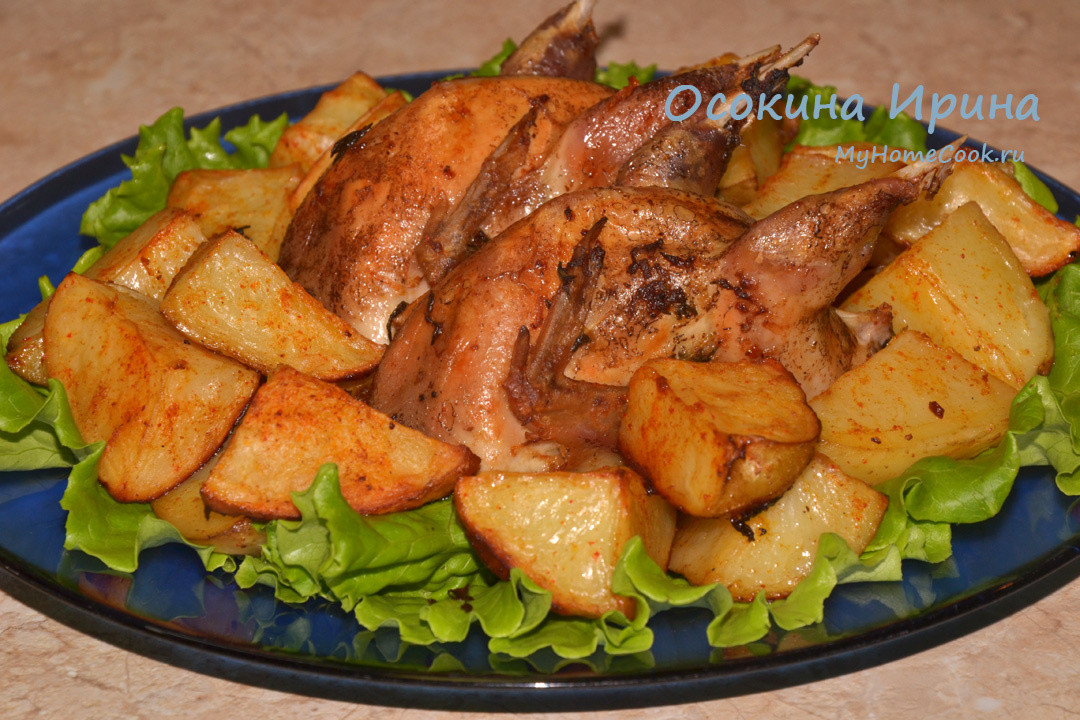 По случаю приобрела небольшую партию домашних перепелов, теперь буду размораживать из частями и баловать себя и супруга этими чудесными диетическими птичками. 4-х размороженных перепелов замочила на несколько часов в воде, промыла и обсушила. В миске смешала сок 1 лимона, 3 измельчённых зубчика чеснока, хорошую щепоть листиков свежего тимьяна, соль и перец по вкусу и замариновала в этом перепелов на 3 - 4 часа, затем переложила в форму. Картофель нарезала небольшими сегментами, посолила, добавила 1 ч.л. паприки, сбрызнула оливковым маслом, перемешала, обложила перепелов в форме, накрыла форму крышкой и запекла в духовке, разогретой до 180 градусов, в течение часа, затем сняла крышку и вернула форму в духовку ещё на 15 минут подрумянить пташек. Ох и вкусно же нам было) Приятного аппетита