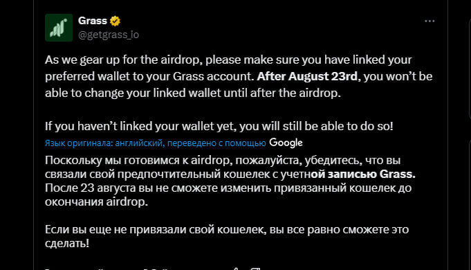 Осталось пару часов, чтобы подключить кошелек к Grass для дропа
