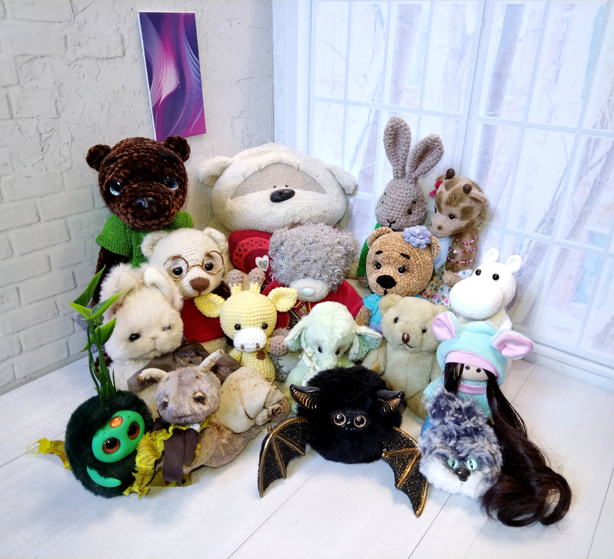 Я уже много раз писала что коллекция моя многогранна и разнообразна. Кроме кукол у меня живут фигурки мягкие игрушки. Вот о моих мягких любимцах я сегодня и расскажу. Условно можно поделить всех моих любимцев на несколько групп. Первые мои игрушечные мишки. На первый взгляд это самые обыкновенные игрушки, но для меня они особенные. Мишек me to you знают все, перед ними трудно устоять. Самый большой медвежонок - первый подарок мне от моего тогда еще будущего мужа, разве можно даже подумать о том, чтобы расстаться с ним. Ну а забавный неуклюжий малыш родом из туманного Лондона. Следующая группа, - вязанные игрушки, кроме зайца в зеленом свитере, все игрушки связаны мной. В планах еще пандочка и друзья для Муми Тролля. Это игрушки разных авторов в основном в смешанной технике. Кроме летучей мышки все куплены практически случайно, но от этого не менее любимы. Ну и наконец игрушки в стиле Тедди. Первым у меня поселился мятный слоненок в качестве игрушки для паолок. Затем у меня появи