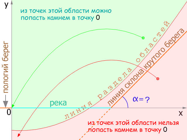 Теперь остается более простая часть - наложить найденную нами параболу раздела областей на рисунок с рекой и посмотреть, при каком минимальном угле наклона линии берегового склона, она еще будет иметь хоть одну общую точку с той областью, откуда можно добросить камень до начала координат.