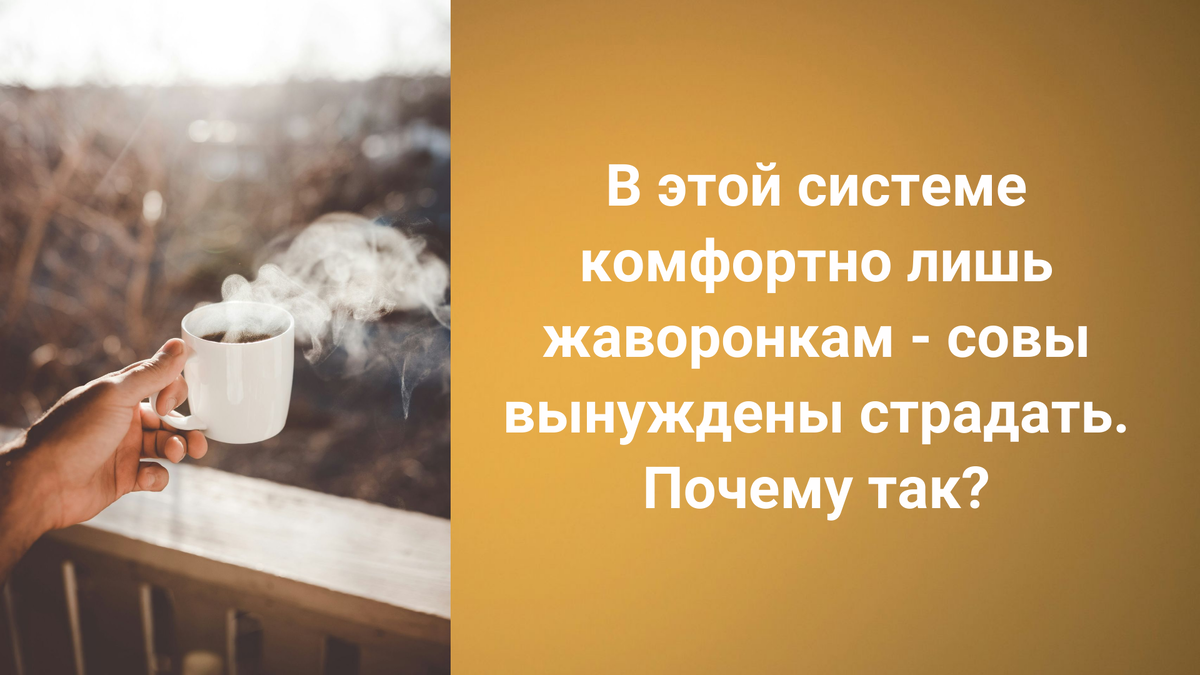 Всё начинается с детского сада. Уже в раннем возрасте нас заставляют приходить в незнакомое здание к 8 утра. Системе такой график удобен, но разве дети выспались? Затем человека ожидает 10 лет "страданий" в школе! Занятия всегда начинаются в 8 утра. Кто создал этот культ "8 утра"? Кому так не спалось? Я всегда завидовал детям, у которых была вторая смена. Мой класс все 10 лет учился в первую смену.