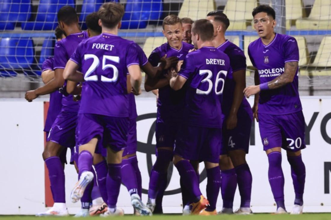 Столичное «Динамо» провело первый матч плей-офф квалификации Лиги Европы с «Андерлехтом» из Брюсселя. Игра вышла упорной, но победу из венгерского Мезекевешда, где соперника принимали белорусы, увезли домой бельгийцы. В нынешнем еврокубковом цикле «Андерлехт», пожалуй, самый грозный соперник «Динамо». Тренер бельгийцев Брайан Ример не отрицал фаворитского статуса своей команды: еще до начала первой встречи он был убежден в итоговой победе «Андерлехта» и выпустил в стартовом составе далеко не всех своих звезд. Это не помешало бельгийцам открыть счет уже на 10-й минуте. Однако дальше игра выровнялась, минчане начали атаковать и имели прекрасный шанс счет сравнять. На 60-й минуте Иван Бахар вышел один на один с голкипером гостей Колином Кусемансом, но пробил во вратаря. Кусеманс в целом был одним из лучших игроков в составе «Андерлехта». И если бы не его сейвы, счет на табло в этот вечер мог бы быть совершенно другим. «Андерлехт» празднует забитый гол А так «Андерлехт» довел встречу до п