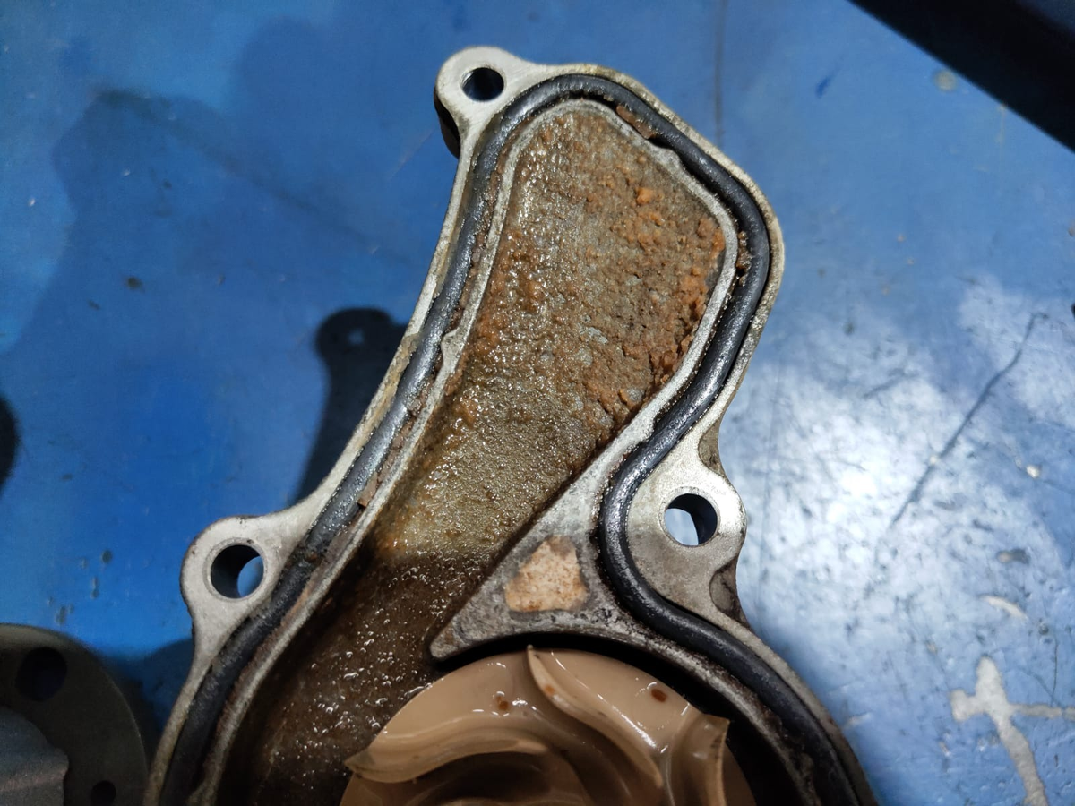 Клиент обратился в наш автосервис с жалобой на посторонний звук со стороны навесного оборудования двигателя. В ходе диагностики нашим специалистом был выявлен источник неприятных звуков. Им оказался водяной насос системы охлаждения двигателя. При демонтаже узла было установлено, что водяной насос вышел из строя из-за образования отложений продуктов распада пакета присадок охлаждающей жидкости.