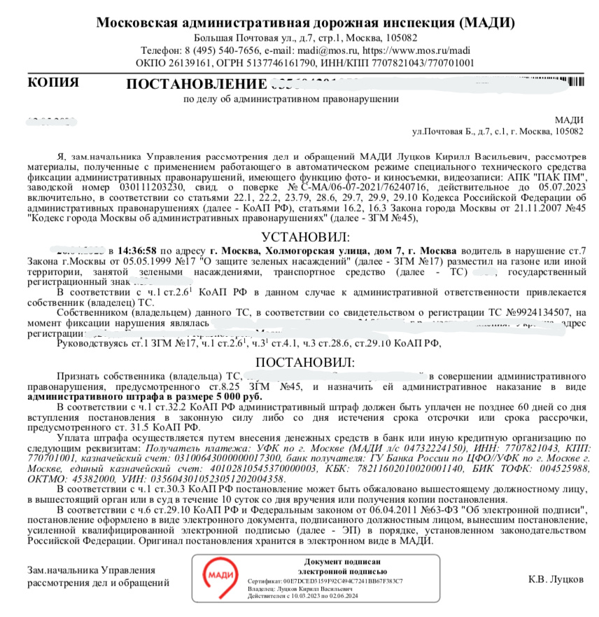 Расскажу свою историю. Может, кому пригодится мой опыт. Прилетел штраф от "активного гражданина" -ПМ Помощника Москвы за парковку на газоне.( ПАК ПМ Программно-аппаратный комплекс -Помощник Москвы позволяет жителям столицы с помощью мобильного приложения фиксировать на камеру смартфона различные нарушения правил парковки транспортных средств и передавать эти данные в ведомства, отвечающие за соблюдение правил дорожного движения) Очень был удивлен т к так не поступаю. Смотрю постановление, меня там "телепортировали" в соседний двор, где и правда есть газон. Но в том дворе я не стоял и газон огорожен забором, что туда при всем желании не въехать. Уж не знаю, как работал GPS на телефоне активиста.. Сверху скриншот с Яндекс панорам.Стоял где машина с открытой дверьюСверху скриншот с Яндекс панорам.Стоял где машина с открытой дверью5000, конечно, не смертельная сумма, но обидно, когда ни за что. Отдельно отмечу, что скидка 50 % за оплату в течение 20 дней для этого штрафа не применяетс