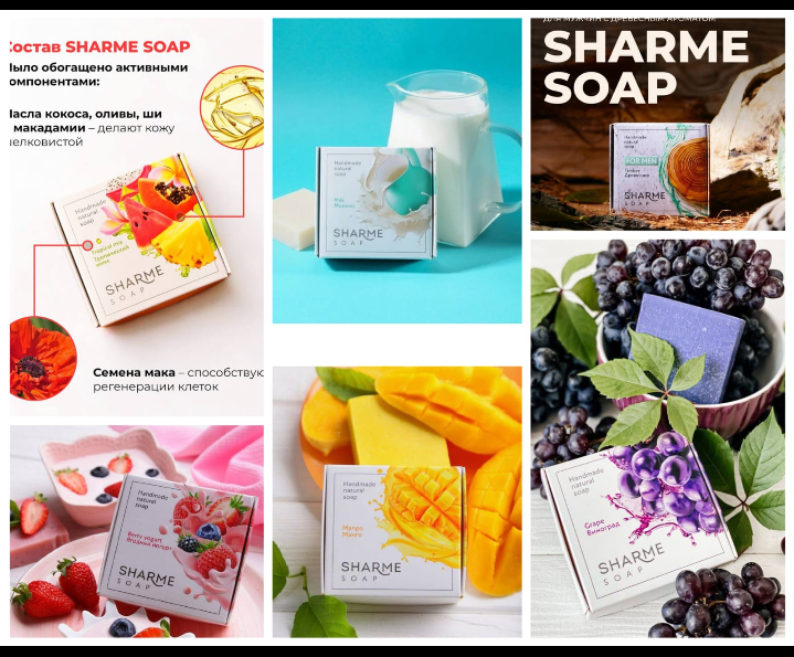Серия натурального мыла ручной работы Sharme Soap создана по холодной технологии «с нуля», которая подразумевает производство продукта не из готовой мыльной основы, а из натуральных растительных масел, без применения синтетических компонентов и искусственных ПАВов. Наше мыло ручной работы, в которое вы влюбитесь с первого взгляда! *А какие ароматы* 😍 🍇Виноград 🥭Манго 🍓Ягодный йогурт 🪵Древесное 🥛Молочное 🍍Тропический микс Большое облако пены бережно очищает кожу, оставляя ощущение увлажнённости и свежести. ✅ Состав мыла обогащен активными компонентами ценных растительных жиров и омыленных масел манго, ши, кокоса и оливы, которые делает кожу нежной и бархатистой. ✅ Натуральный экологичный состав без парабенов, фосфатов и сульфатов нежно и деликатно очищает даже самую чувствительную кожу, сохраняя естественный липидный барьер кожи. ✅ Благодаря образованию обильной пены мыло имеет экономичный расход. *390₽*