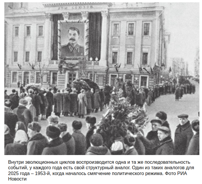 Поскольку внутри эволюционных циклов воспроизводится одна и та же последовательность событий, у каждого года есть свой структурный аналог. Для приближающегося 2025 года таковыми являются 1857 год, когда в России были отменены военные поселения и началась серьезная подготовка к отмене крепостного права, и 1953 год, когда после смерти Сталина в СССР произошло смягчение политического режима и начался переход к коллективному партийному руководству. В обоих случаях переход к реформам носил эволюционный характер: Великие реформы проводил Александр II, унаследовавший власть от Николая I, а реформы 1950-х и 1960-х годов – преемники Сталина в руководстве СССР, которые, несмотря на борьбу за власть, опирались на созданные Сталиным политические институты, в том числе монополию правящей Коммунистической партии.В этой связи около 2025 года в России с высокой вероятностью должен начаться переход к новой эпохе реформ, который будет продиктован как внутренними предпосылками (в том числе исчерпанием действующей модели экономического роста, основанной на масштабных вливаниях бюджетных средств), так и сдвигами на мировой арене.Прологом для новой эпохи скорее всего станет эволюционное обновление политической элиты, которое при этом не будет сопровождаться ломкой политических институтов и крушением государства, как это было в 1917 году или в 1989–1991 годах. Относительно мягкая экономическая и политическая либерализация может создать условия для некоторой нормализации отношений с США (как это было в 1953 году) и для выхода России из радикальной конфронтации со странами Запада (как это было после Крымской войны). Впрочем, это не означает, что напряженность в отношениях между Россией и Западом полностью сойдет на нет, в том числе из-за весьма вероятных разногласий вокруг условий реинтеграции России в мировую экономику и международную финансовую систему, которые также будут претерпевать масштабные изменения.Переход к основному этапу реформ, вероятнее всего, завершится около 2029 года, после чего начнется короткий, но интенсивный период проведения преобразований, пик которых, как следует из модели, будет приходиться на 2029–2033 годы. Именно в этот период, по всей видимости, будут проводиться ключевые преобразования, включая изменение баланса между ветвями власти, планомерное разгосударствление экономики и перераспределение налоговых поступлений между регионами и федеральным Центром. При этом активной фазе реформ, вероятно, будет предшествовать еще один этап обновления элиты: 2029 год является структурным аналогом 1957-го, когда произошли важные изменения в советской элите.В целом ближайшие годы открывают новые возможности для проведения преобразований в России, включая создание работающих государственных институтов и глубокое реформирование экономики. Сумеет ли ими воспользоваться Россия, зависит не только от глобальных сдвигов, но и от способности интеллектуального, предпринимательского и политического класса сохранить холодную голову в эпоху реформ и потрясений.