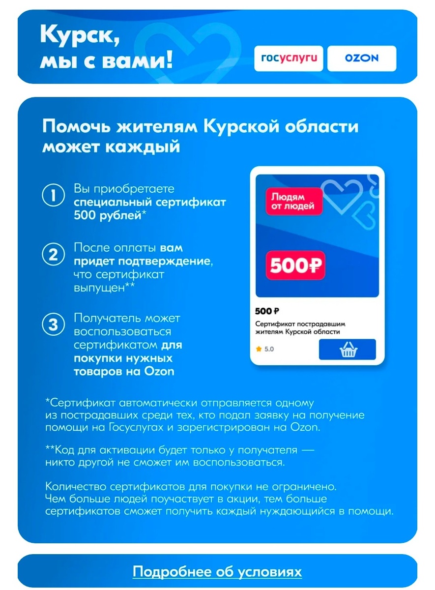 Чуть не забыла получить кэшбэк от Озон за июль! Вернее, я-то забыла, а вот Озон не забыл, и мне на карту его уже начислил: +1857 руб. Моя прелессть! И что я вижу, пока любуюсь на эту сумму? Озон призывает всех пожертвовать жителям Курской области сколько не жалко, от 500 руб. Пожертвование осуществляется сертификатами. Распределение, похоже, идет через Госуслуги. По-моему, идея хорошая. Каждый пострадавший из Курской области, получивший сертификат, приобретет себе то, что ему реально нужно. Надеюсь, желающих помочь соотечественникам будет достаточно, чтобы каждый нуждающийся получил не один сертификат, а гораздо побольше! Ну а что сумма 1 сертификата маленькая, так зато большее количество желающих людей сможет оказать посильную помощь. Ииииии.... Мой кэшбэк от Озона уходит на помощь Курской области! (Интересно, эту статью тоже пессимизируют, как и одну другую патриотичную статью про помощь кому надо?) Но я была бы не я, если бы не выгадала и здесь! Мне по одной новой кредитке КЕБ нужно