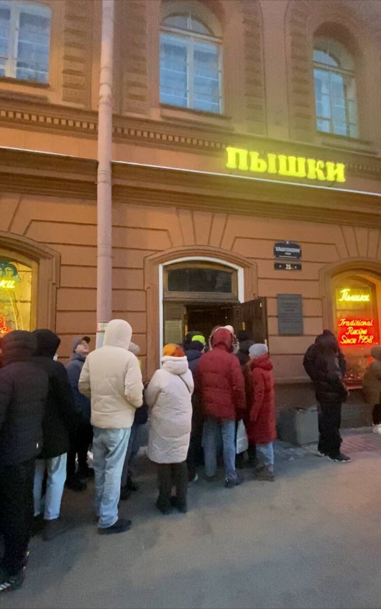Ого, сколько людей! ЗА ЧЕМ СТОИМ, ТОВАРИЩИ? - когда проходишь мимо здания Большая Конюшенная, 25 в Санкт-Петербурге, всегда встречаешь длинную очередь из людей. И такую очередь мы обнаружили даже в 20 градусный мороз. Новый 2024 год мы с Дарьей встречали в культурной столице России — Санкт-Петербурге. Провели в этом замечательном городе целую неделю. Конечно же, перед нами стояла задача не сидеть в номере отеля, а хотелось максимально посмотреть интересные места. Не смотря на зимнюю погоду, гололедицу и сильный мороз. И первое, что нам посоветовали наши питерские знакомые — сходить в самую старейшую пышечную города, расположенную на Большой Конюшенной улице. Где подают знаменитое блюдо еще со времён СССР — пышки.