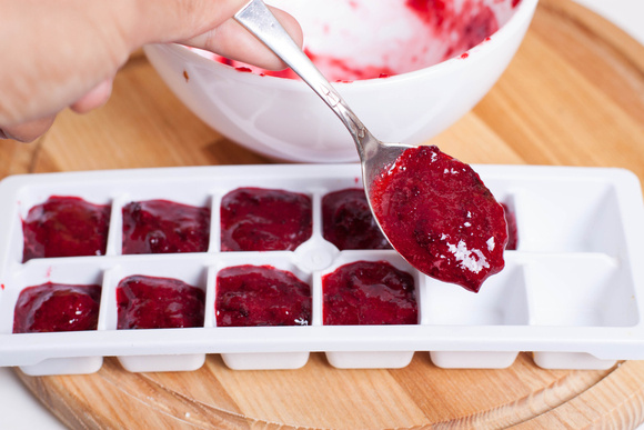 - Разложите ягодное пюре в формы для льда, добавьте в него корицу, гвоздику и бадьян. Сверху положите дольку лимона.
