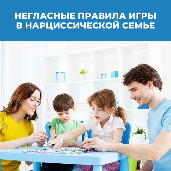 В доме нарциссов существуют негласные правила взаимодействия, направленные на поддержку родителей: 1. Нарцисс всегда прав Это первое правило, которому подчиняются все. Даже минимальные сомнения в правоте нарцисса расцениваются как предательство. 2. Должен найтись виноватый Если происходит что-то плохое – от увольнения до пролитого чая, – в этом нужно кого-то обвинить. Естественно, только не нарцисса. 3. Уязвимость опасна Если вы прослушали шутку, уронили вилку или у вас тяжелый или плохой день – не важно, – проявление уязвимости поставит вас под удар. 4. Ошибки постыдны Совершение ошибки, даже безобидной, становится причиной унижений и позора. 5. Вы обязаны принять чью-то сторону Всегда есть вина и стыд – и всегда есть разные стороны баррикад. И если вы не на стороне нарцисса, значит, вы не правы и проиграете. 6. Любви и уважения всегда не хватает Любовь и уважение, восполняемые в здоровой семье, у нарциссов предназначены только для того, кто их достоин, обычно это «золотой