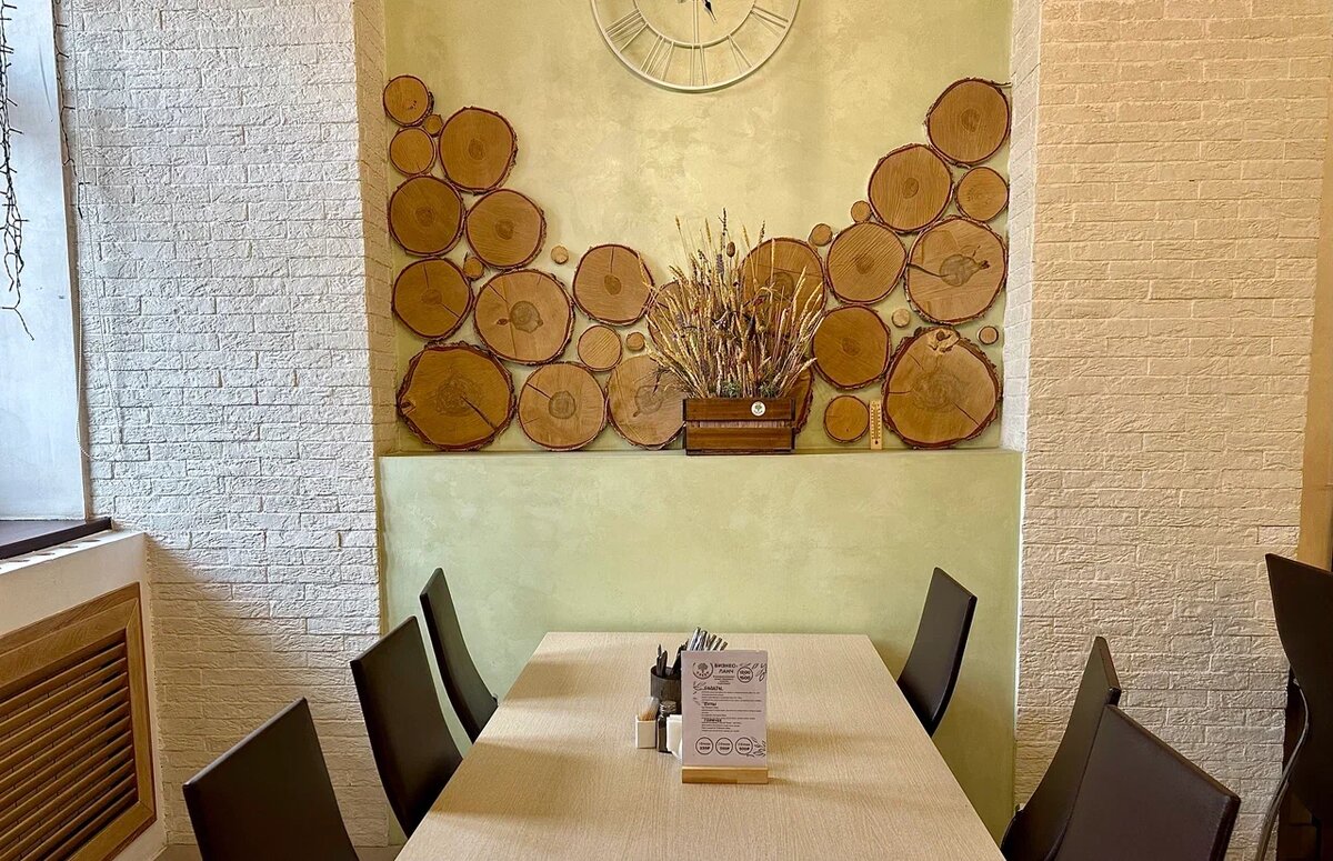 Пока ждала свой заказ, присмотрелась к интерьеру: в спокойных тонах, с элементами настоящего дерева и зелеными вставками. Ассоциации с теплым летним днем на природе.