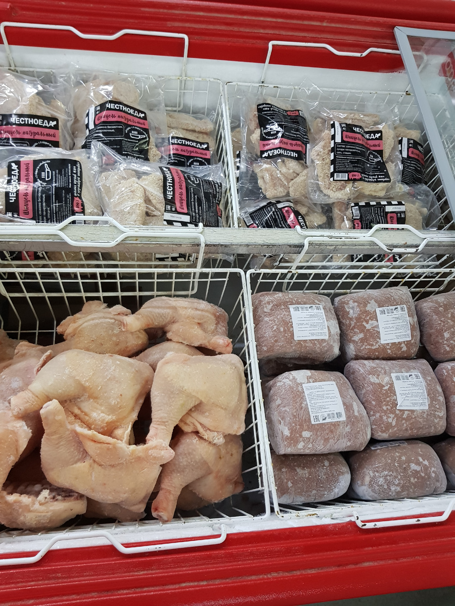 Приветствую всех на своём канале! Решила купить куриных голеней в Светофоре, но их не оказалось в продаже, зато были окорочка. К этим окорочкам скорее применимо слово окоротища, большущие, мясистые (или накаченные🤔) Очень подозрительные, хотя очень хотелось именно таких пожарить. Но еле сдержала души прекрасные порывы, уж очень подозрительно округлые. Рядом с окороками фарш "По - домашнему". Категория В. В составе на первом месте мясо свинины, потом говядина и смесь пряностей. Состав хороший, но поди разберись, что там на самом деле. Хотя и в других магазинах тоже в фарше всякое возможно. Только, если сам купишь кусок мяса, накрутишь, тогда понятно из чего и что. Хотя и мясо могут напичкать. В общем, замкнутый круг. Фарш расфасован по 1 кг. Цена 177 рублей. Очень интересно, если кто покупал, котлеты из него нормальные получаются, лепятся хотя бы? В соленьях увидела маринованную капусту "По - грузински" со свёклой. Я вам про неё уже писала, мне очень понравилась, вкусная! Производитель