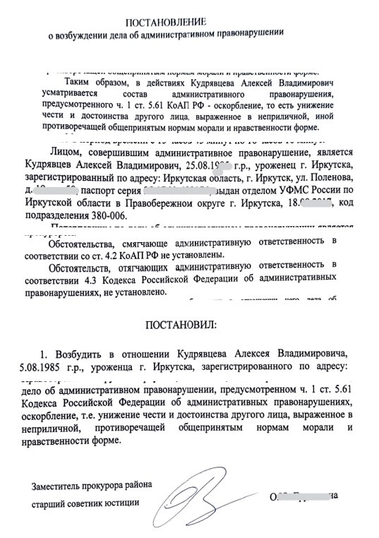 Далее мнение эксперта и решение суда о признании Кудрявцева виновным в оскорблении