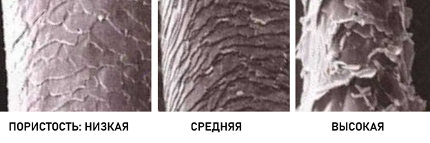 Когда мы говорим про пористость волос, то имеем в виду степень прилегания чешуек волоса друг к другу. Если между чешуйками наблюдается свободное пространство, то волосы считаются пористыми. Верхний слой волос содержит липидную прослойку, которая носит название «клеточный мембранный комплекс» (КМК). Она, словно клей, скрепляет чешуйки волоса и помогает удерживать влагу в волосяном стержне. Чем меньше КМК у волоса – тем выше пористость и, соответственно, пушистость и обезвоженность волос. Волосы могут быть пористыми от природы, а могут стать таковыми в результате термического воздействия и/или окрашивания. Условно волосы делят на 3 группы: с низкой пористостью (очень гладкие, «стекловидные»), средней пористостью и высокой (пушистые). Сальный секрет кожи головы способен восстановить недостаток КМК, однако его хватает только на 10-15 см от корней волос. На этом участке у большинства людей пористость волос наименее низкая, поэтому мужчины, носящие короткие стрижки, редко сталкиваются пробле