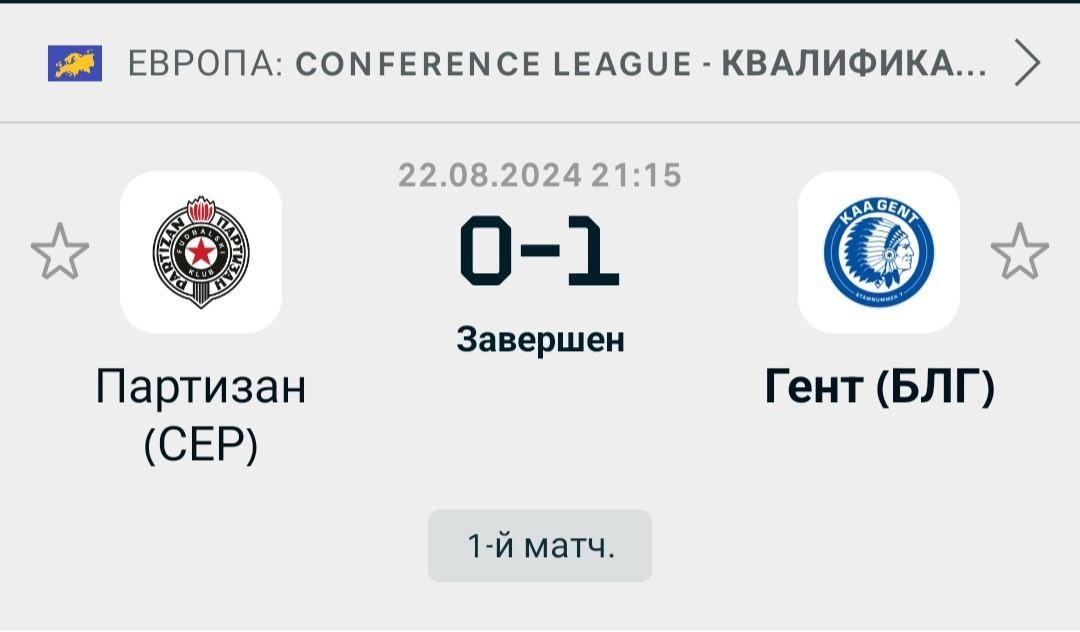 Всем привет. В Белграде состоялся первый матч последнего раунда квалификации Лиги конференций. Партизан принимал Гент. Лига конференций, третий по престижности европейский футбольный турнир отличается от Лиги чемпионов и Лиги Европы лишь тем, что напрямую в групповой этап в этом турнире не могут попасть даже топ-клубы. Мы все это прекрасно знаем. Но здесь в очередной паре мы видим встречу команд, которые наверное могли бы пройти квалификацию и в Лиге чемпионов, и в лиге Европы в разные годы. Просто во второстепенных лигах естественно не беря в счёт РПЛ проблематично отдельно взятой команде попасть в групповой этап абсолютно любого европейского футбольного турнира на прямую. Тут речь не идёт даже о лиге конференций, речь идёт в целом о еврокубках. Вчера в Белграде мы увидели противостояние Партизана из Сербии и Гента из Бельгии. Обе команды в начале сезона играли очень нестабильно. И Партизан, и Гент имеют проблемы в обороне. Две примерно равные команды. Поэтому и фаворита было определить сложно. На деле мы увидели преимущества со стороны Партизана при этом победил в этом матче всё равно Гент. Хотя перед этой игрой у меня были предположения, что скорее всего здесь будет какая-нибудь ничья. Гент В итоге забил гол на 16 минуте, сделал ставку на удержание счёта, пытался удержать победный для себя результат. Гену в этом плане в ответной игре будет легче. Она пройдёт в Бельгии, на его поле. Поэтому я и говорю, что у Гента есть преимущество перед ответной игрой на своём поле. Как говорится, дома и стены помогают, а значит при определённых раскладах в групповой этап лиги конференций может попасть именно Гент. Как оно будет на самом деле, узнаем через неделю