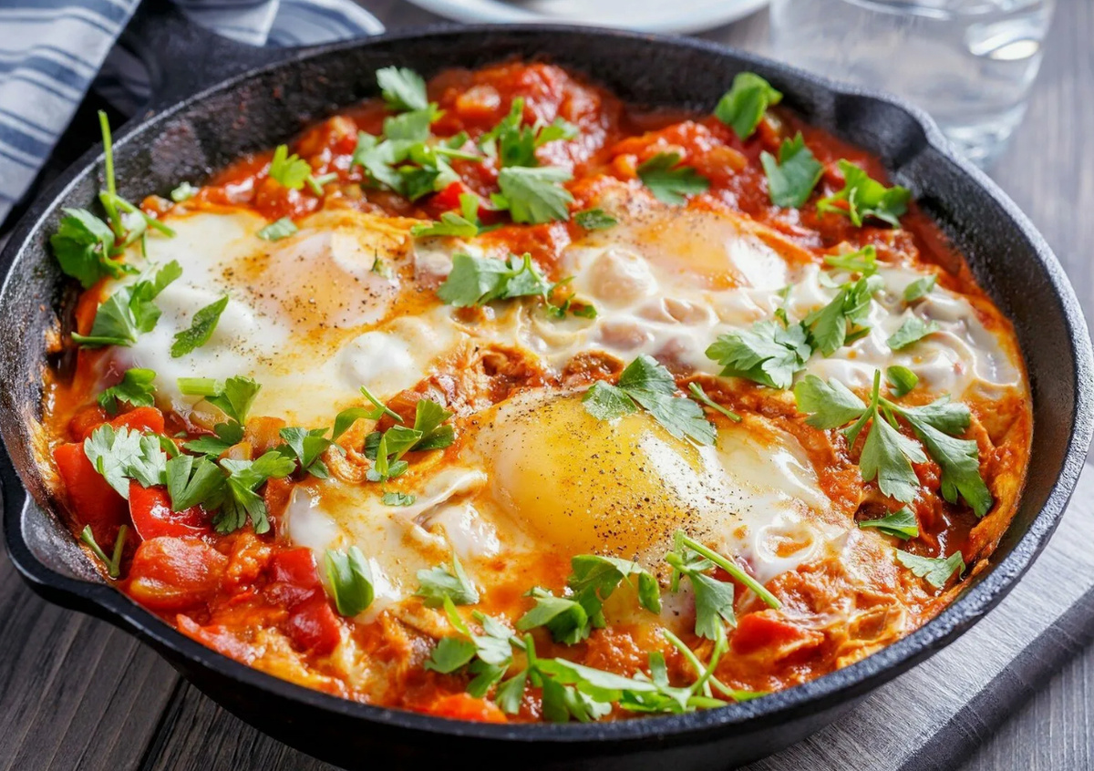 Шакшу́ка — блюдо из яиц, жареных в соусе из помидоров, острого перца, лука и приправ, входит в кухню большинства арабских стран и кухню Израиля. Подаётся на завтрак с хлебом или питой. Согласно Джоане Нейтан, шакшуку придумали в магрибских владениях Османской империи в середине XVI века после того, как помидоры были впервые завезены на территорию государства испанским конкистадором Эрнаном Кортесом в рамках Колумбова обмена. Основные ингредиенты шакшуки: Возможные дополнительные ингредиенты: Яйца жарятся в соусе из помидоров, лука, острого перца и приправ. Готовое блюдо подаётся на завтрак с хлебом или питой. Шакшука схожа с такими блюдами как менемен, матбуха и яичница. Для приготовления шакшуки в сезон лучше всего использовать свежие и ароматные овощи, которые придадут блюду насыщенный вкус. Вот список овощей, которые идеально подойдут для шакшуки в это время года:
