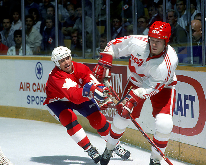 – Каждое утро первые двадцать минут мы работали в 14-килограмовых поясах. Играли в них на ограниченном пространстве один на один или два на два с условием: забивать можно в любые ворота. Только перекрыл путь сопернику, а он развернулся в другую сторону и опять за ним гонись. Играли и в регби на льду, кувыркались на асфальте, бегали по ступенькам с партнером на плечах – а Витя Глушенков, например, весил под 110 кг. Бывали и изощрения – один цепляется сзади, другой спереди – и тащишь двух человек. От нагрузок шумело в ушах, но эффект я ощутил в игре – через два года меня взяли на Кубок Канады.