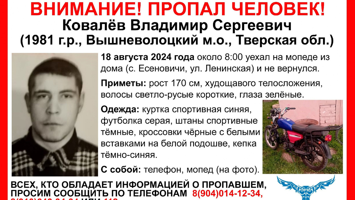 В селе Есеновичи Вышневолоцкого округа Тверской области пропал 43-летний Владимир Сергеевич Ковалев. Как сообщает тверской волонтерский поисково-спасательный отряд "Сова", 18 августа мужчина уехал на мотоцикле из дома на улице Ленинская и не вернулся. Приметы: рост 170 см, худощавого телосложения, волосы светло-русые короткие, глаза зелёные. Одежда: куртка спортивная синяя, футболка серая, штаны спортивные тёмные, кроссовки чёрные с белыми вставками на белой подошве, кепка тёмно-синяя. С собой: телефон, мопед (как на фото). Всех, кто обладает информацией о пропавшем, волонтеры просят позвонить по телефонам отряда: 8 (910) 646-34-34 и 8 (904) 014-12-34