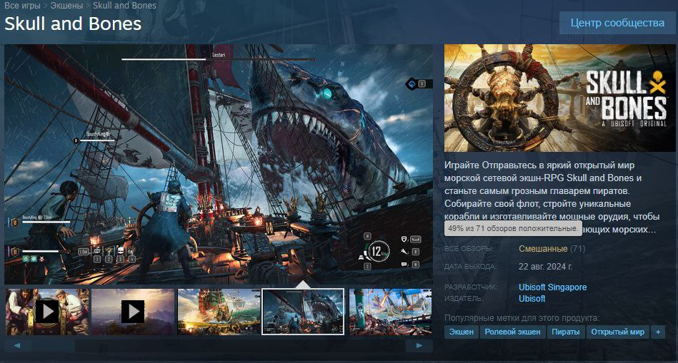 Вчера в Steam вышла Skull&Bones — игра от Ubisoft Сразу с выходом игра получила 60-процентную скидку(8000₸), но это не помогло — пиковый онлайн достиг отметки всего в 507 игроков, а положительных отзывов всего 49%. В основном ругают оптимизацию и отсутствие контента. Юбисофт контора?