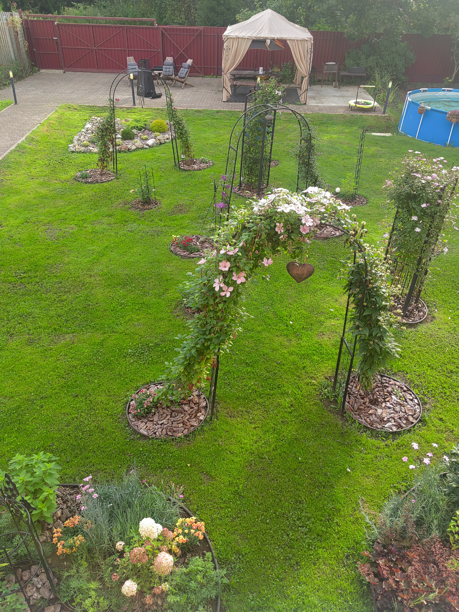 Мои новенькие клематисы- реки("Арабелла"и "Гудзон Ривер")за лето неплохо нарастили зеленую массу и красуются друг перед другом нарядами оттенков голубого и сиренево-фиолетового.