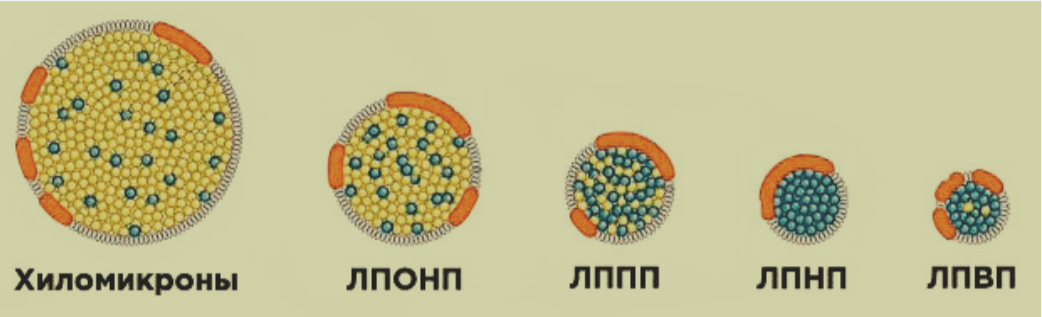 Транспорт липидов осуществляется с помощью специальных транспортных белков - липопротеинов. Хиломикрон, образованный в клетках тонкого кишечника, необходим для переноса экзогенного жира в печень. Он представляет собой большую жировую каплю (состоящую из триглицеридов, холестерина, фосфолипидов и аполипопротеина). В печени осуществляется синтез и секреция в кровь липопротеидов очень низкой и высокой плотности. ЛПОНП в процессе транспортировки превращаются в ЛПНП, которые улавливаются рецепторами клеток периферических тканей.