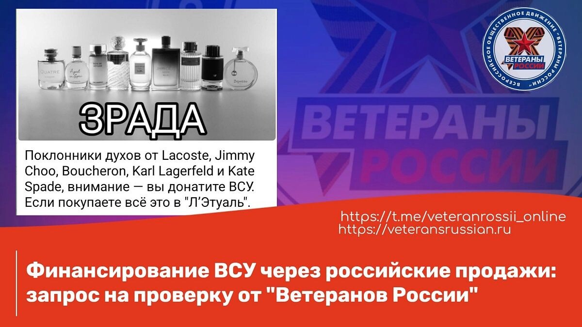 Общероссийское общественное движение "Ветераны России" направило обращения в Генеральную прокуратуру РФ и Следственный комитет России с просьбой провести проверку информации о деятельности крупнейшей французской парфюмерной компании Interparfums. Согласно имеющимся данным, в 2022 году компания выкупила у генерального директора сети «Л’Этуаль» Татьяны Володиной часть бизнеса "Брокард" на Украине, через который осуществляется поставка продукции из ЕС. Более того, на официальном сайте компании с гордостью указано, что ежегодно Вооруженные Силы Украины (ВСУ) получают от Interparfums 4,3 млн евро (200 млн гривен) с доходов от её деятельности, включая продажи на территории России. Таким образом, средства, полученные от продажи духов брендов Lacoste, Jimmy Choo, Boucheron, Karl Lagerfeld и Kate Spade на территории Российской Федерации, могут быть направлены на финансирование ВСУ через сеть «Л’Этуаль». Объем поставок продукции Interparfums в Россию увеличился на 7% по сравнению с прошлым годом
